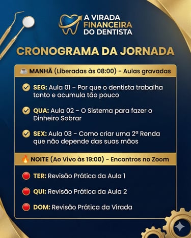Criei este evento por um motivo simples: a organização financeira tradicional não funciona para a nossa realidade. O dentista tem custo alto, renda variável e imprevistos que nenhum economista entende.