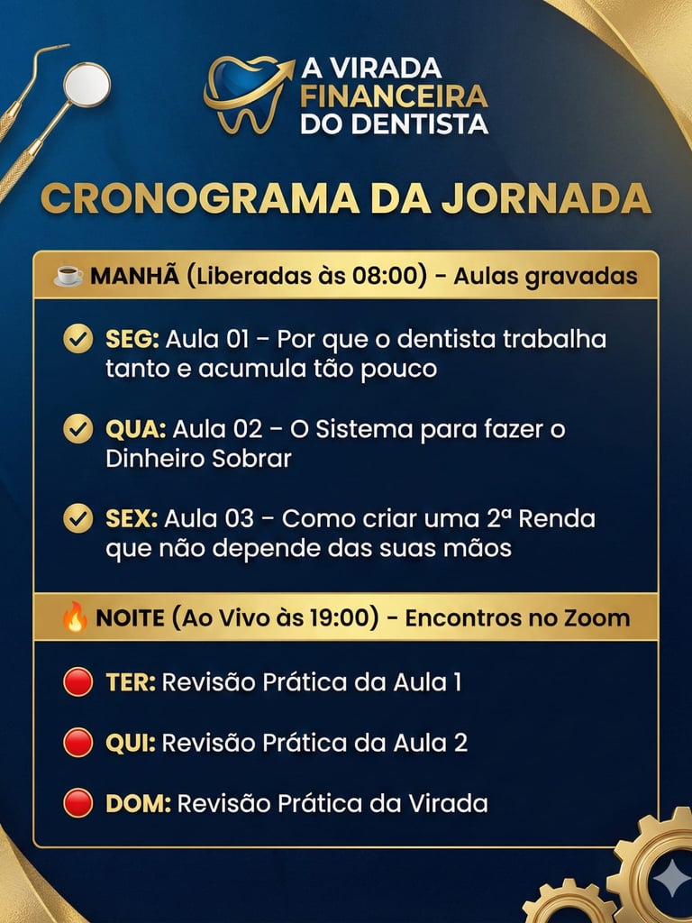🔥 NOITE (Ao Vivo no Zoom às 19:00): Mentoria prática. É aqui que a mágica acontece. Vamos tirar dúvidas e mostrar como aplicar o método na sua realidade.