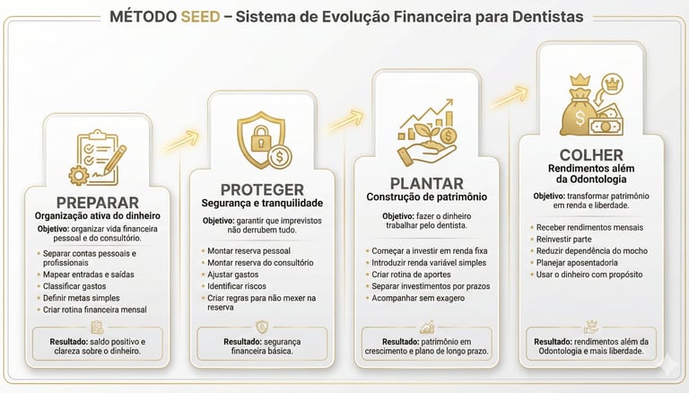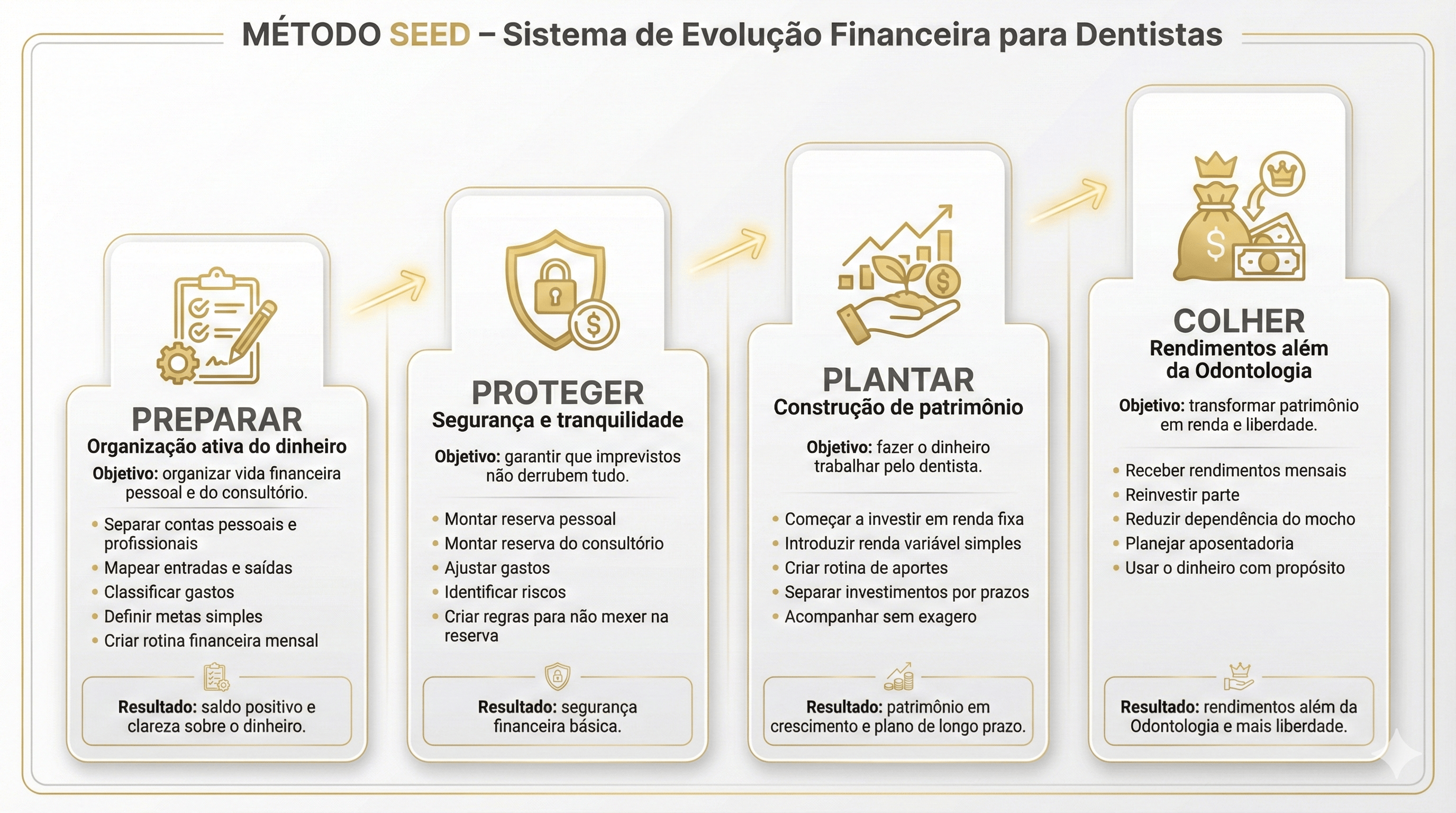 Nós vamos avançar juntos, em um verdadeiro passo a passo, resolvendo uma etapa da sua vida financeira por vez — desde a organização básica até a colheita dos seus rendimentos.