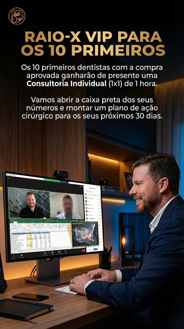 É menos do que você cobra em uma única restauração de resina simples ou em uma profilaxia no mês inteiro. Um único procedimento básico no seu consultório já paga a parcela da Mentoria. O resto é lucro e paz de espírito.