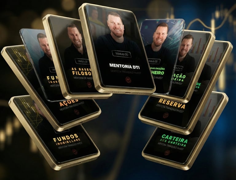 Aulas gravadas, direto ao ponto, do básico ao avançado. Sem financês chato, sem papo técnico e sem enrolação. Você assiste no seu tempo — na hora do almoço ou no intervalo de um paciente — e aprende a organizar as finanças e investir com segurança.