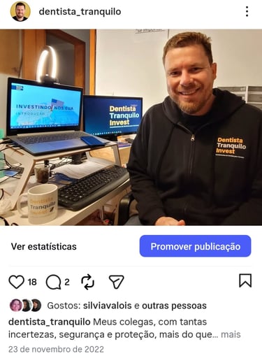 Hoje, acordo todo dia com um propósito claro: ajudar dentistas a terem a vida tranquila que merecem. A estarem presentes para suas famílias. A dormirem em paz sabendo que o futuro está construído. A viverem do consultório, não para o consultório.
